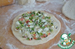 • Сверху накрываем другой лепешкой, по краю защипываем и придавливаем, чтобы она была как можно тоньше.