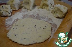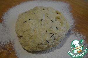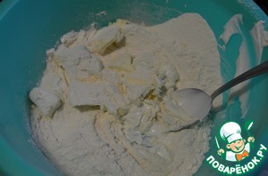 Масло из холодильника натереть на терке, добавить холодную сметану, всыпать муку, добавить рис и рукой замесить тесто.