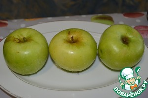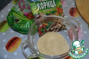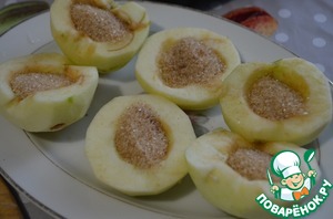 С яблок снять кожуру, разрезать на две половинки, вырезать середину, наполнить их сахаром с корицей.