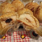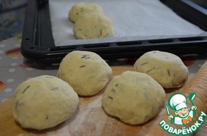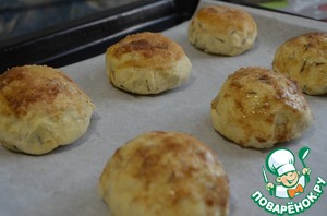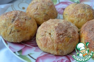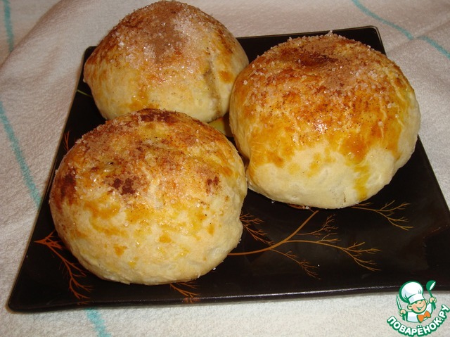Смазать верх плюшек яичным желтком и обмакнуть в оставшийся сахар с корицей. Выпекать при температуре 175 градусов 25 минут.