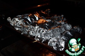 Также завернуть каждую шпажку в фольгу и выпекать при температуре 160 градусов 45 мин.