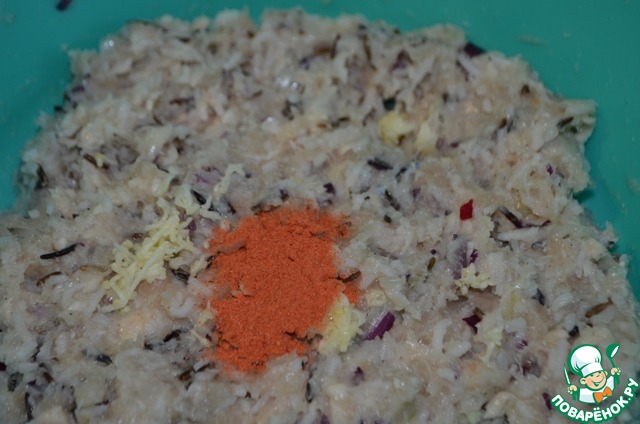 Смешать перекрученный мясной фарш с луком и рис, добавить паприку, чеснок, соль и специи. Я для начинки перекрутила куриное мяса с луковыми сердцевинами.