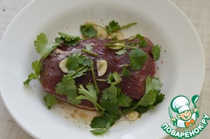 В чашке смешать нарезанный чеснок, кинзу, масло, соевый соус, смесь перцев. Замариновать в этой смеси филе. Оставить на 30 минут.