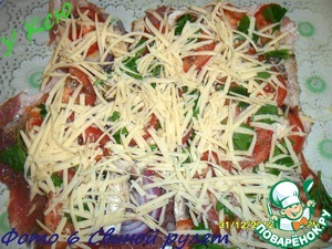 Через сутки достаем, разворачиваем, 1-й слой укладываем лук маринованный.