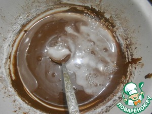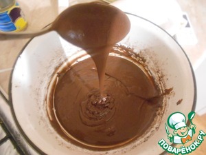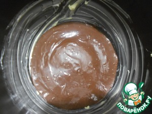 • В теплый заварной крем добавляем перетертое масло с сахаром и какао, хорошо все перемешиваем.