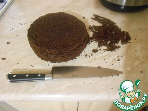 • Складываем коржи вместе и обрезаем края, обрезки трем на мелкую терку для присыпки торта.