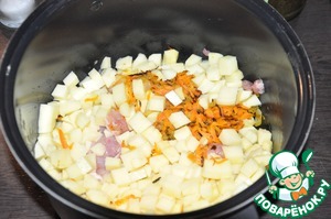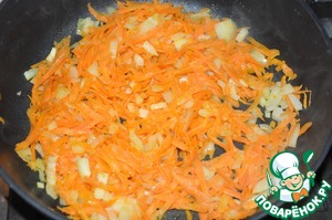 Морковку трем на терке, лук мелко режем. Высыпаем на сковородку и пассируем... Масла практически нет. Готовим картофель, разрезая его на небольшие кубики.