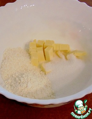 Для штрейзеля: Сливочное масло порубить ножом в смеси кокосовой стружки, сахара и муки.