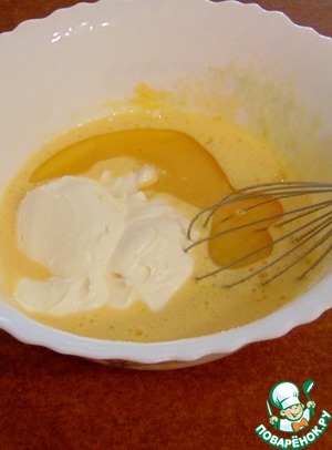 Добавить йогурт, растительное масло. Хорошо перемешать венчиком.