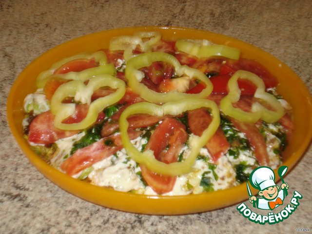 Тем временем режем перец болгарский (чисто для украшения) и помидор дольками, шинкуем зелень (какая вам нравится).