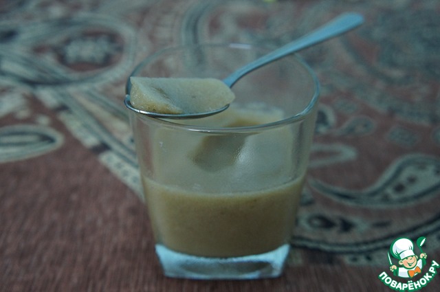 Перемалываем. Пусть останутся небольшие кусочки банана в пюре. Пюре получается взбитым, с пузырьками воздуха.