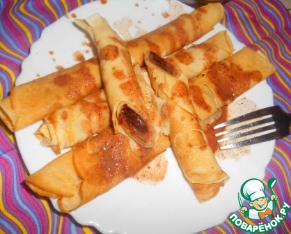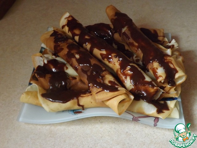 Изумительно вкусные блинчики, очень похожие по вкусу на те, что раньше можно было заказать в кафе "Шоколадница". Есть ли они в меню сейчас - не знаю, но вряд ли их качество сохранилось прежним. Недавно я нашла рецепт этих блинчиков в интернете. Оказывается, этот десерт легко сделать в домашних условиях! Угощайтесь, дорогие друзья!