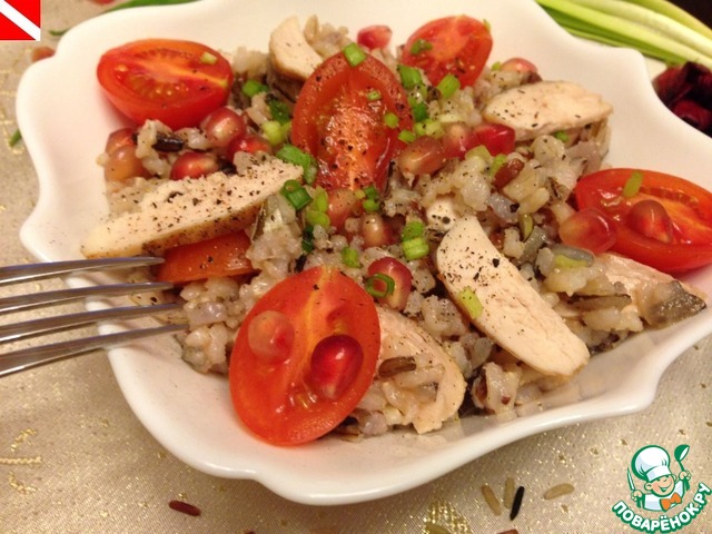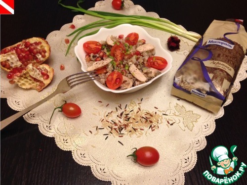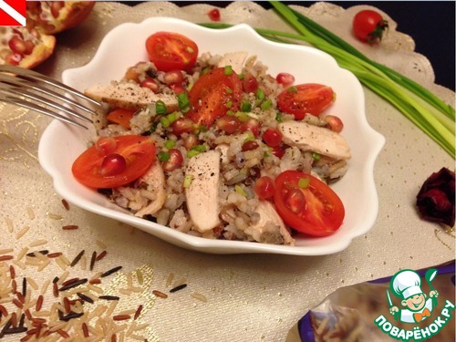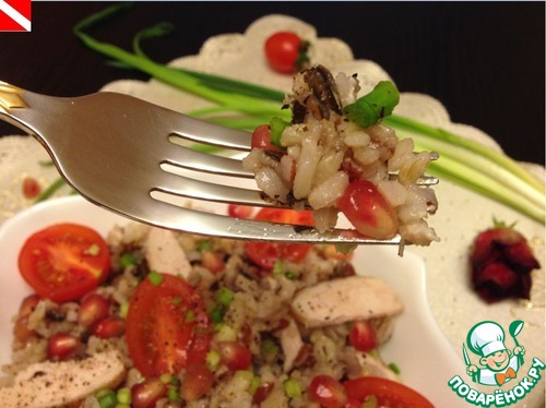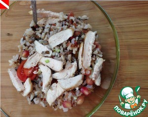В остывший до комнатной температуры рис добавляем черри, нарезанную пластинками грудку, лук, заправляем заправкой.