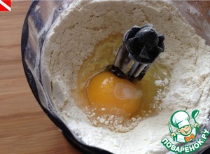 • Получается вот такая масса, скорее, крошки. Выкладываем на стол, делаем в центре углубление,