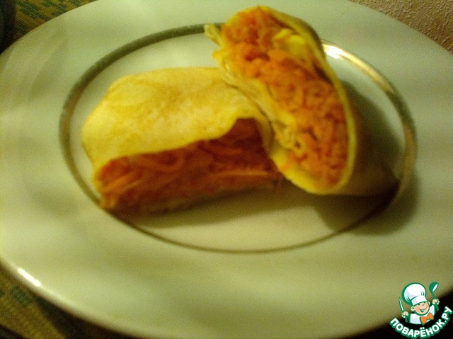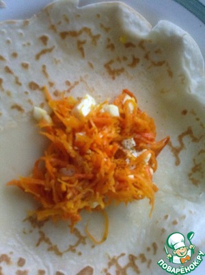 4. Смешать готовую морковку с яйцами и начинить блинчики.