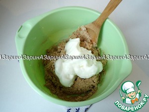 Всыпать сухие ингредиенты, перемешать. Добавить сметану и опять перемешать.