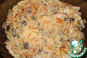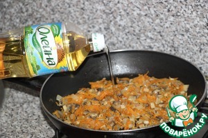 Для начинки нарезаем мелко лук, натираем морковь на средней терке, обжариваем на растительном масле «Олейна классическая» до мягкости. Добавляем нарезанные ломтиками грибы, жарим до выпаривания жидкости (около 10 мин), остужаем.