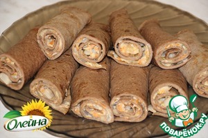 Горячие блинчики смазываем начинкой и заворачиваем рулетом. Разрезаем наискосок пополам.
