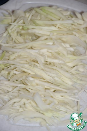 Капусту нашинковать, добавить к луку, налить 50 мл воды и потушить под крышкой 20 мин.
