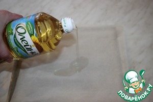 Осталось собрать пирог. Противень застелить бумагой для выпечки и смазать растительным маслом «Олейна классическое».