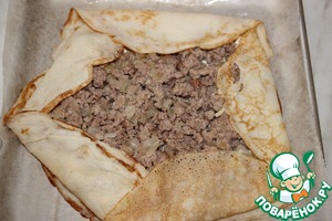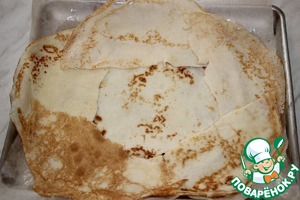 Уложить блины в форму следующим образом: первый блин на дно формы, другими блинами закрыть края.