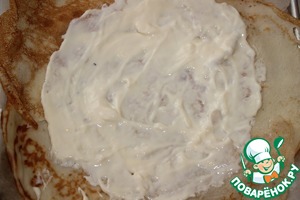 Намазываем блинчик плавленным сыром, взбитым со сметаной.