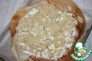 Далее снова промазываем сыром со сметаной, выкладываем слой капустной начинки.