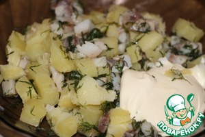 Для первой начинки: сельди мелко нарезать. Картофель отварить в мундире, очистить и мелко нарезать. Смешать вместе сельдь, картофель, заправить сыром. Можно добавить укроп.