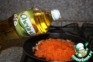 Для второй начинки. Лук мелко нарезать, морковь натереть на средней терке и обжарить до готовности в растительном масле «Олейна с оливковым маслом».