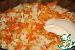 Кальмары отварить в подсоленной воде и мелко нарезать. Рис отварить в подсоленной воде. Соединить кальмары, рис и лук с морковью. Перемешать, по необходимости посолить.