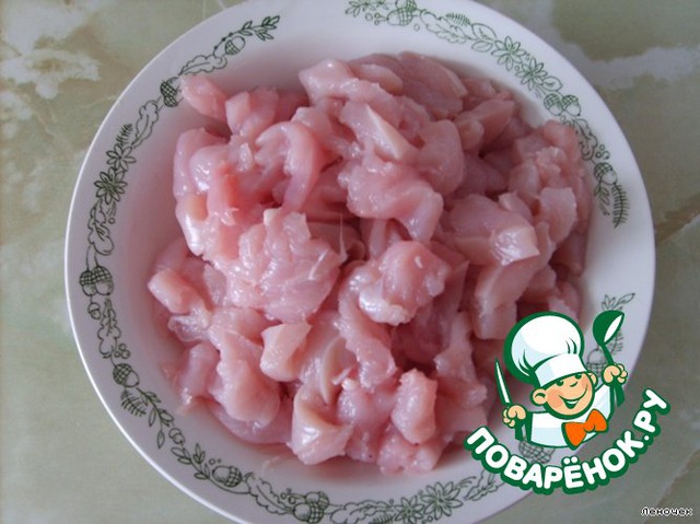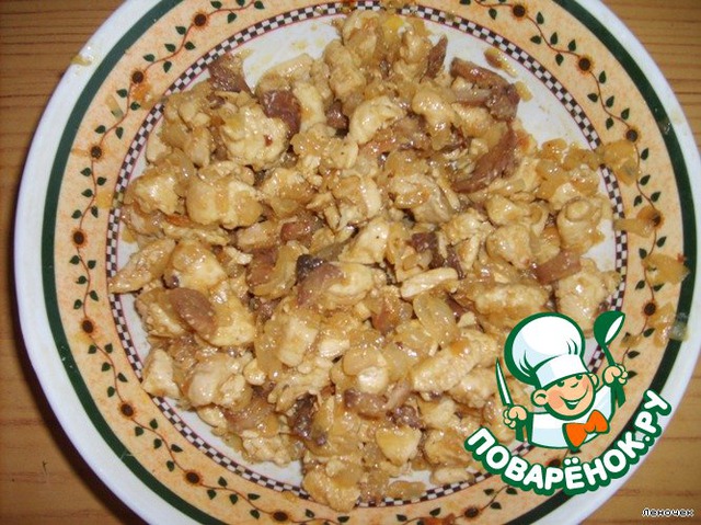 • Курицу порезать на кусочки и обжарить в масле, добавить приправу, жарить 15-20 минут, выложить на тарелку.
