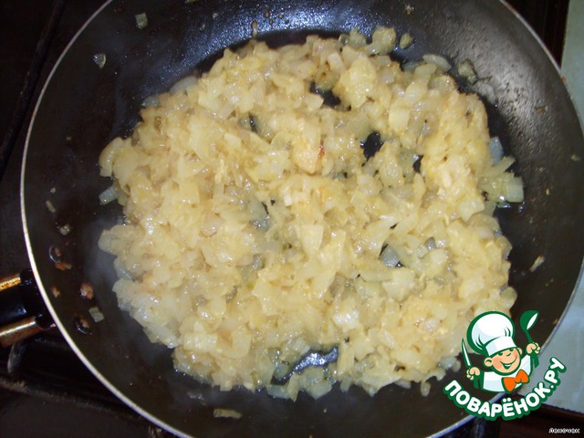 • Лук измельчить и тоже обжарить на масле минут 15-20 (он должен стать мягким), в конце жарки добавить лимонный сок. (У меня лимона не было, я добавила магазинный лимонный сок. Но по желанию можно и не добавлять. Или добавить какой-нибудь другой ингредиент). Лук выложить на тарелку, чтобы остыл.