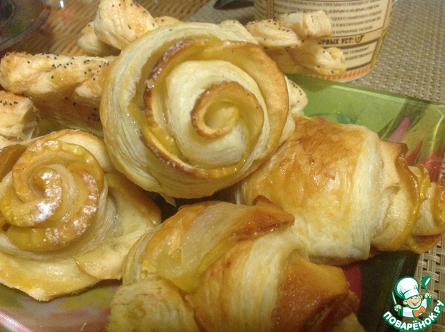- Тесто слоеное бездрожжевое (делала как для "цветочков", которые ниже) — 500 г