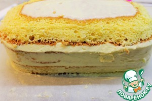 Из бумаги вырезаем шаблон ( как на фото), прикладываем к коржу и вырезаем три коржа.