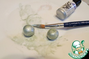 Также скатаем из мастики два шарика. Покрасим изделия в любимый цвет либо гелевыми красителями, либо кандурином и нанесем по центру торта.