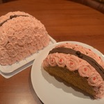Внутри ванильный и шоколадный бисквит, клубнично-сметанный крем и розы из масляного крема)