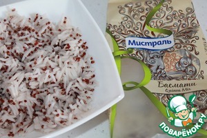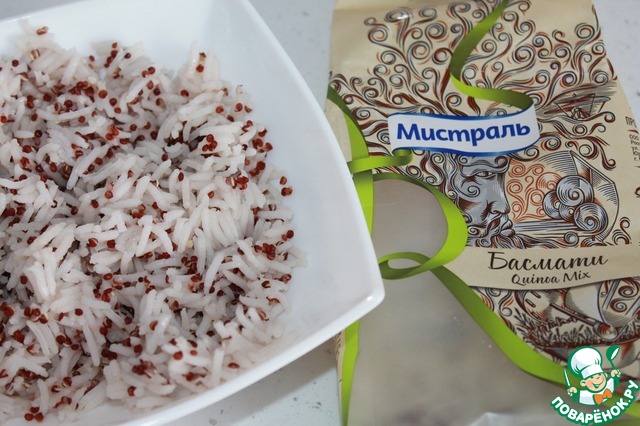 Отвариваем рис Басмати Quinoa Mix ТМ Мистраль в подсоленной воде в соотношении 1:2, до впитывания всей жидкости. Остужаем.