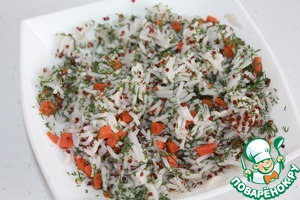 Морковь отвариваем, нарезаем кубиками. Укроп нарезаем мелко. Смешиваем с рисом.