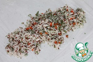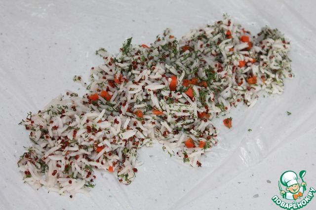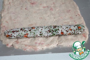 Выстилаем на столе пищевую пленку, выкладываем начинку.
