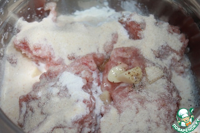 К фаршу добавляем манку, яйцо, сливки, крахмал, сливочное масло, чеснок, соль и перец.