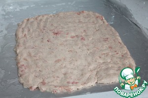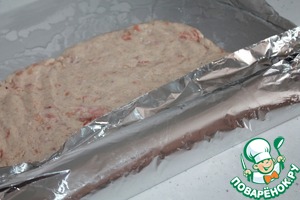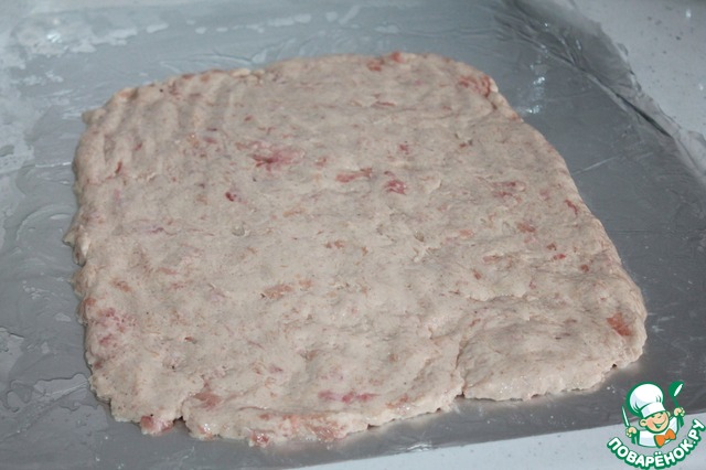 Выстилаем на стол фольгу, смазываем ее растительным маслом. Равномерно распределяем фарш. Помогаем смоченными в воде руками.