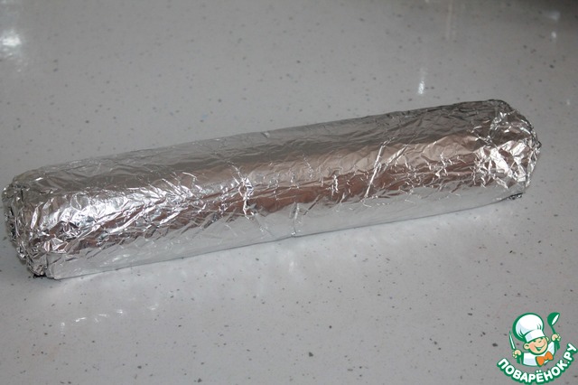 С помощью фольги сворачиваем рулет, каждый виток уплотняем руками.
