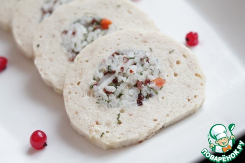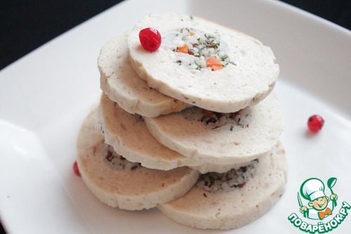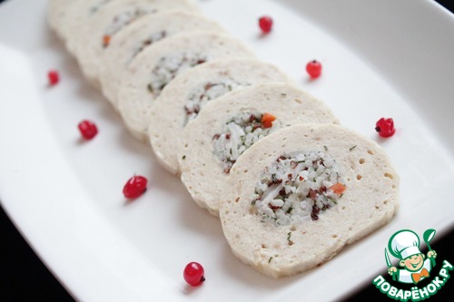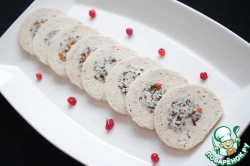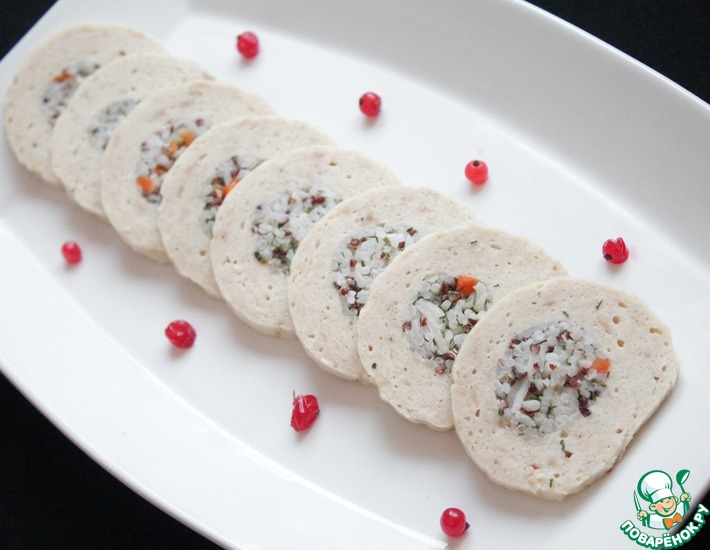 Прекрасный рулет, который станет альтернативой колбасе. Я добавила в него немного цвета и вкуса с помощью риса. Получилось очень вкусно и празднично.