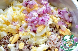 К сваренному рису с киноа добавить нарезанные кубиками варёные яйца и мелко нарезанный красный лук.
