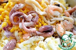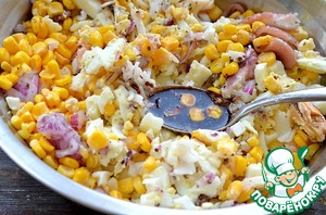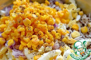 Всыпать консервированную кукурузу (без жидкости). Поперчить по вкусу.