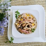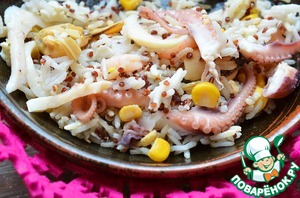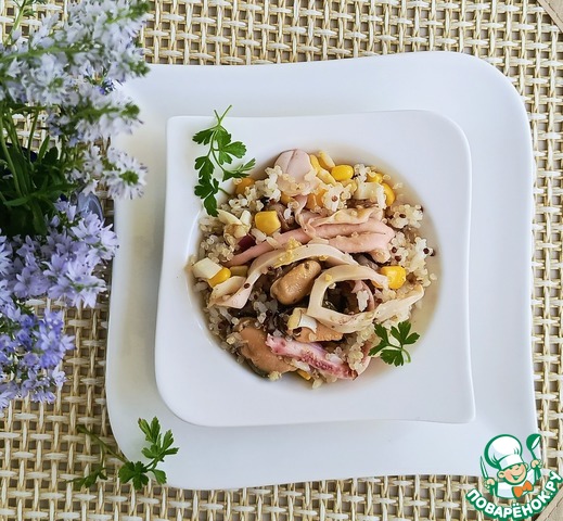 Я дважды готовила этот салат, и получилось так, что для разных компаний. Всех, без исключения, ввёл в заблуждение один ингредиент. Почему-то именно он вызвал бурные споры по поводу своего происхождения. Благодаря отсутствию в салате майонеза (все ингредиенты отчётливо видны) и именно присутствию морепродуктов разных видов создаётся впечатление присутствия в салате икры. Во всяком случае, именно такая версия была оглашена с утверждением в качестве доказательства : - "ОНО" же лопается! "Оно" - это киноа. Если хотите повеселиться и удивить, то смело готовьте этот салат. По вкусу он очень напоминает знаменитый рисовый салат с крабовыми палочками. Но после этого рецепта вы поймёте, что прежде вы готовили эрзац.