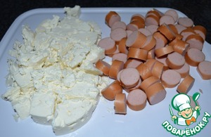 Сосиски нарезать крожочками, сыр крупными кубиками.