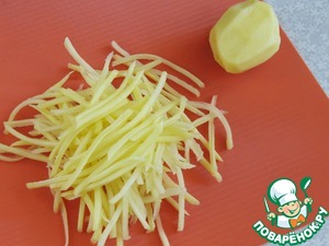 Картофель моем, чистим, натираем на тёрке по-корейски. Промокаем бумажным полотенцем и посыпаем кукурузным крахмалом через ситечко.