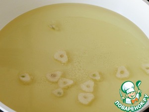 Растительное масло разогреваем в удобной для вас посуде. 2 зубка чеснока крупно нарезаем и обжариваем в масле 2-4 минуты, чеснок достаём из масла и выбрасываем.