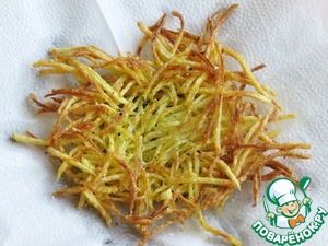 Картофель-пай выкладываем на бумажное полотенце и даём стечь лишнему жиру. Пока он горячий, солим и перчим по вкусу.